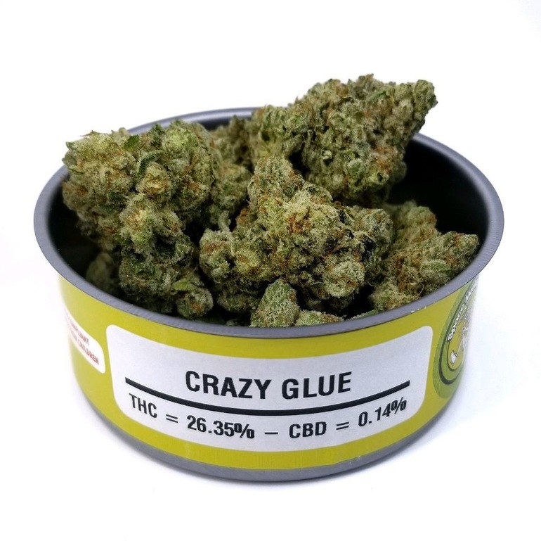 crazy glue is an indica strain , This strain’s genetics include:Gorilla Glue #4, and Super Silver Chemdog Haze. It originates from: Afghanistan, Colombia, India, Mexico, and Thailand. It may taste fruity, spicy, earthy, sour, piney. When smoked, this strain can make you feel euphoria, creativity, calm, numbness, appetite gain, and pain relief. Negative side effects can include: slight anxiety and slight dry_mouth. Crazy Glues powerful euphoria is suited for seasoned consumers and over time can become rather sedative with continued consumption.